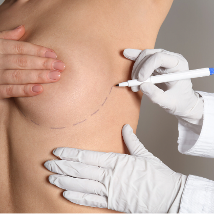 retirada de toda a mama ou apenas do tecido glandular seguida de reconstrução imediata com retalhos e/ou prótese de silicone utilizando técnicas oncoplástica.